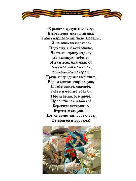 9 МАЯ В рыже-черную полоску, В этот день мне папа дал, Знак гвардейский, знак Победы, Я на лацкан повязал. Подхожу я к ветеранам, Честь по праву отдаю, За великую победу, Я вам всех благодарю! Руку крепко пожимая, Улыбнулся ветеран, Грудь наградами сверкает, Рядом метки старых ран, И тебе сынок спасибо, Знать я честно воевал, Почитаешь, это любо, Прослезился и обнял! Берегите ветеранов, Берегите стариков, Им на долю так досталось, От врагов и дураков!