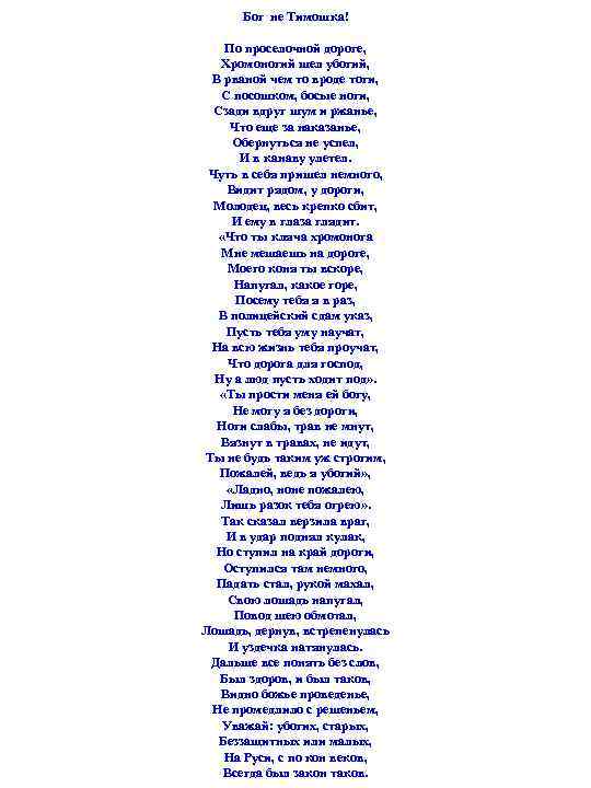Бог не Тимошка! По проселочной дороге, Хромоногий шел убогий, В рваной чем то вроде тоги, С посошком, босые ноги, Сзади вдруг шум и ржанье, Что еще за наказанье, Обернуться не успел, И в канаву улетел. Чуть в себя пришел немного, Видит рядом, у дороги, Молодец, весь крепко сбит, И ему в глаза глядит. «Что ты кляча хромонога Мне мешаешь на дороге, Моего коня ты вскоре, Напугал, какое горе, Посему тебя я в раз, В полицейский сдам указ, Пусть тебя уму научат, На всю жизнь тебя проучат, Что дорога для господ, Ну а люд пусть ходит под» . «Ты прости меня ей богу, Не могу я без дороги, Ноги слабы, трав не мнут, Вязнут в травах, не идут, Ты не будь таким уж строгим, Пожалей, ведь я убогий» , «Ладно, ноне пожалею, Лишь разок тебя огрею» . Так сказал верзила враг, И в удар поднял кулак, Но ступил на край дороги, Оступился там немного, Падать стал, рукой махал, Свою лошадь напугал, Повод шею обмотал, Лошадь, дернув, встрепенулась И уздечка натянулась. Дальше все понять без слов, Был здоров, и был таков, Видно божье проведенье, Не промедлило с решеньем, Уважай: убогих, старых, Беззащитных или малых, На Руси, с по кон веков, Всегда был закон таков.