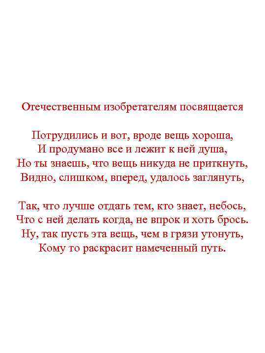 Отечественным изобретателям посвящается Потрудились и вот, вроде вещь хороша, И продумано все и лежит к ней душа, Но ты знаешь, что вещь никуда не приткнуть, Видно, слишком, вперед, удалось заглянуть, Так, что лучше отдать тем, кто знает, небось, Что с ней делать когда, не впрок и хоть брось. Ну, так пусть эта вещь, чем в грязи утонуть, Кому то раскрасит намеченный путь.