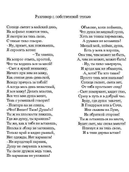 Разговор с собственной тенью Солнце светит в майский день, На асфальт ложится тень, Я смотрю на тень свою, С тенью тихо говорю. - Ну, привет, как поживаешь, Я спросить хотел: – Ты знаешь, На вопрос ответь, простой, Что ты ходишь все за мной! - Свет я яркий ненавижу, Ничего при нем не вижу, Как слепая день-деньской, Всюду прячусь за тобой! А когда весь день ненастный, Я все вижу! Делать властна, Все что мне душа велит, Тень с усмешкой говорит! - Повтори-ка не спеша, «Что! Велит! Твоя! Душа!» ? Ты ж на плоскости лежишь, Где же душу, ты хранишь? Ты же, как к тебе не встанешь, Плоска и сбоку не заглянешь, Только край и видно рваный, Нет одежды. Нет карманов! - Не юродствуй паренек, Душу не свернешь в комок, Ты свою дружок ведь тоже, По карманам не уложишь! Объясню, коли поймешь, Что душа не медный грош, Хоть на тонны перемножь, А руками не возьмешь! Милый мой, пойми, душа, Есть у всех и хороша, Она тем, чем может не быть, А, чем не может, может быть! - Ну, ты лихо завернула, И вроде как не обманула, А, хотя! Ты кто такая? Просто тень моя шальная! Солнце гаснет, света нет, От тебя простынет след! - Свет померкнет, видит глаз, Сразу в путь и в добрый час. Буду, где душа захочет, В Гондурасе или в Сочи, Или скажем на Луне, На обратной стороне! Ты ж останешься на месте, Будет свет, мы снова вместе! Плюнул я на тень свою, И в тени дерева встаю!