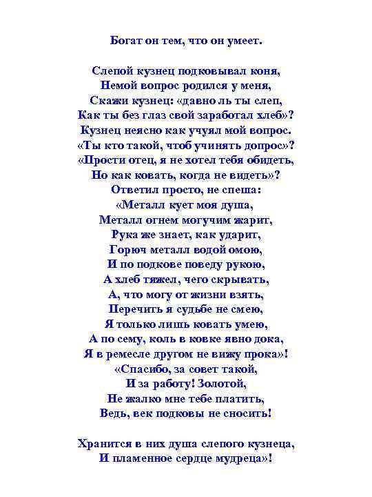 Богат он тем, что он умеет. Слепой кузнец подковывал коня, Немой вопрос родился у меня, Скажи кузнец: «давно ль ты слеп, Как ты без глаз свой заработал хлеб» ? Кузнец неясно как учуял мой вопрос. «Ты кто такой, чтоб учинять допрос» ? «Прости отец, я не хотел тебя обидеть, Но как ковать, когда не видеть» ? Ответил просто, не спеша: «Металл кует моя душа, Металл огнем могучим жарит, Рука же знает, как ударит, Горюч металл водой омою, И по подкове поведу рукою, А хлеб тяжел, чего скрывать, А, что могу от жизни взять, Перечить я судьбе не смею, Я только лишь ковать умею, А по сему, коль в ковке явно дока, Я в ремесле другом не вижу прока» ! «Спасибо, за совет такой, И за работу! Золотой, Не жалко мне тебе платить, Ведь, век подковы не сносить! Хранится в них душа слепого кузнеца, И пламенное сердце мудреца» !