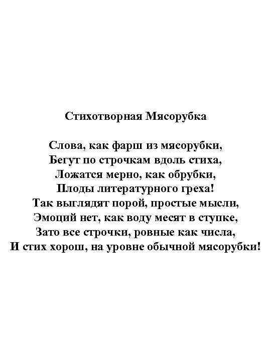 Стихотворная Мясорубка Слова, как фарш из мясорубки, Бегут по строчкам вдоль стиха, Ложатся мерно, как обрубки, Плоды литературного греха! Так выглядят порой, простые мысли, Эмоций нет, как воду месят в ступке, Зато все строчки, ровные как числа, И стих хорош, на уровне обычной мясорубки!