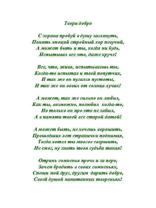 Твори добро С экрана пробуй в душу заглянуть, Понять эмоций стройный хор певучий, А может быть и ты, когда ни будь, Испытывал все это, даже круче! Все, что, живя, испытываешь ты, Когда-то испытал и твой попутчик, И так же он пугался пустоты, И так же он ловил от солнца лучик! А может, так же сильно он любил, Как ты, возможно, полюбил когда-то, Но только он про это не забыл, А в памяти твоей все старой датой! А может быть, не хочешь ворошить, Прошедших лет странички поднимая, Тогда хотел ты многое свершить, Не смог, ну знать твоя судьба такая! Отринь сомненья прочь и за перо, Зачем бродить в своих сомненьях, Спеши мой друг, другим дарить добро, Своей душой напитанных твореньях!