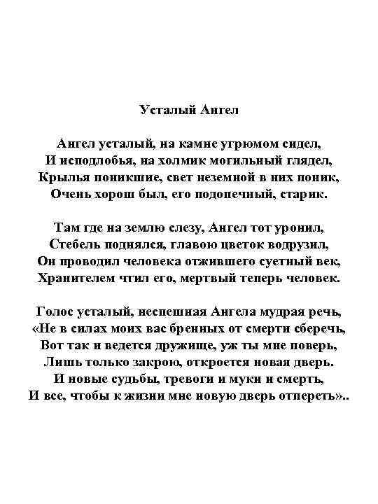 Усталый Ангел усталый, на камне угрюмом сидел, И исподлобья, на холмик могильный глядел, Крылья поникшие, свет неземной в них поник, Очень хорош был, его подопечный, старик. Там где на землю слезу, Ангел тот уронил, Стебель поднялся, главою цветок водрузил, Он проводил человека отжившего суетный век, Хранителем чтил его, мертвый теперь человек. Голос усталый, неспешная Ангела мудрая речь, «Не в силах моих вас бренных от смерти сберечь, Вот так и ведется дружище, уж ты мне поверь, Лишь только закрою, откроется новая дверь. И новые судьбы, тревоги и муки и смерть, И все, чтобы к жизни мне новую дверь отпереть» . .