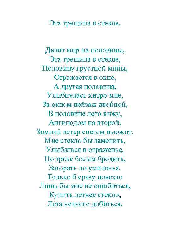 Эта трещина в стекле. Делит мир на половины, Эта трещина в стекле, Половину грустной мины, Отражается в окне, А другая половина, Улыбнулась хитро мне, За окном пейзаж двойной, В половине лето вижу, Антиподом на второй, Зимний ветер снегом вьюжит. Мне стекло бы заменить, Улыбаться в отраженье, По траве босым бродить, Загорать до умиленья. Только б сразу повезло Лишь бы мне не ошибиться, Купить летнее стекло, Лета вечного добиться.