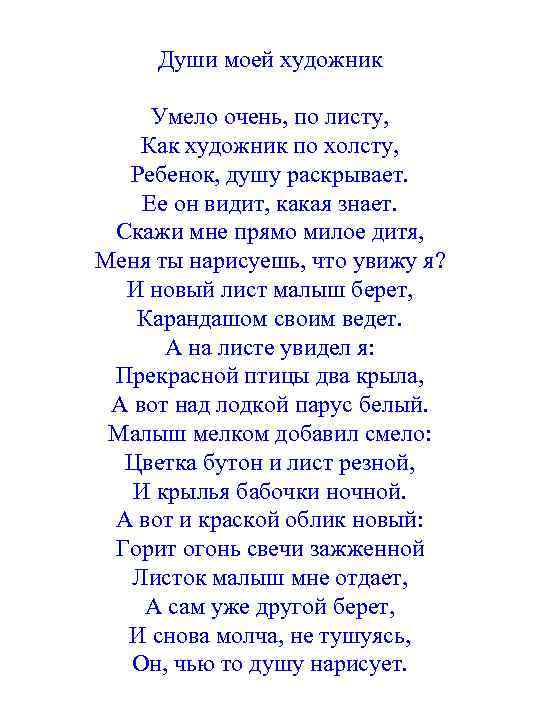 Души моей художник Умело очень, по листу, Как художник по холсту, Ребенок, душу раскрывает. Ее он видит, какая знает. Скажи мне прямо милое дитя, Меня ты нарисуешь, что увижу я? И новый лист малыш берет, Карандашом своим ведет. А на листе увидел я: Прекрасной птицы два крыла, А вот над лодкой парус белый. Малыш мелком добавил смело: Цветка бутон и лист резной, И крылья бабочки ночной. А вот и краской облик новый: Горит огонь свечи зажженной Листок малыш мне отдает, А сам уже другой берет, И снова молча, не тушуясь, Он, чью то душу нарисует.