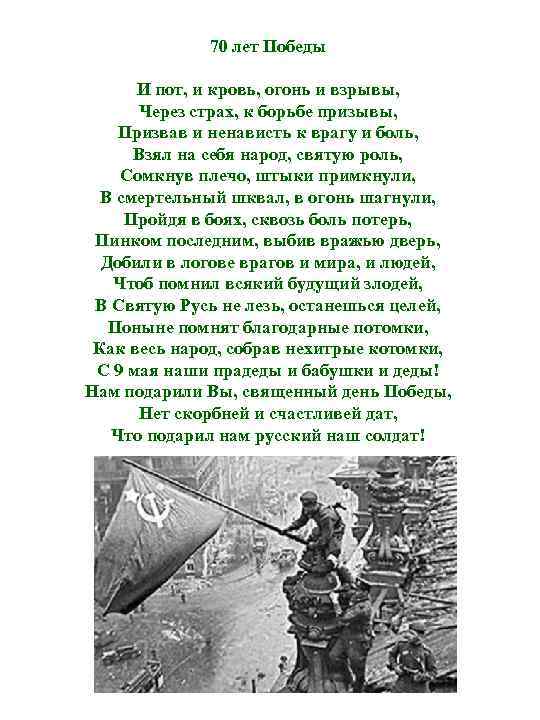 70 лет Победы И пот, и кровь, огонь и взрывы, Через страх, к борьбе призывы, Призвав и ненависть к врагу и боль, Взял на себя народ, святую роль, Сомкнув плечо, штыки примкнули, В смертельный шквал, в огонь шагнули, Пройдя в боях, сквозь боль потерь, Пинком последним, выбив вражью дверь, Добили в логове врагов и мира, и людей, Чтоб помнил всякий будущий злодей, В Святую Русь не лезь, останешься целей, Поныне помнят благодарные потомки, Как весь народ, собрав нехитрые котомки, С 9 мая наши прадеды и бабушки и деды! Нам подарили Вы, священный день Победы, Нет скорбней и счастливей дат, Что подарил нам русский наш солдат!