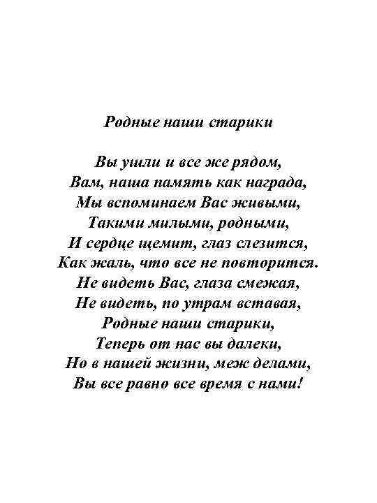 Родные наши старики Вы ушли и все же рядом, Вам, наша память как награда, Мы вспоминаем Вас живыми, Такими милыми, родными, И сердце щемит, глаз слезится, Как жаль, что все не повторится. Не видеть Вас, глаза смежая, Не видеть, по утрам вставая, Родные наши старики, Теперь от нас вы далеки, Но в нашей жизни, меж делами, Вы все равно все время с нами!