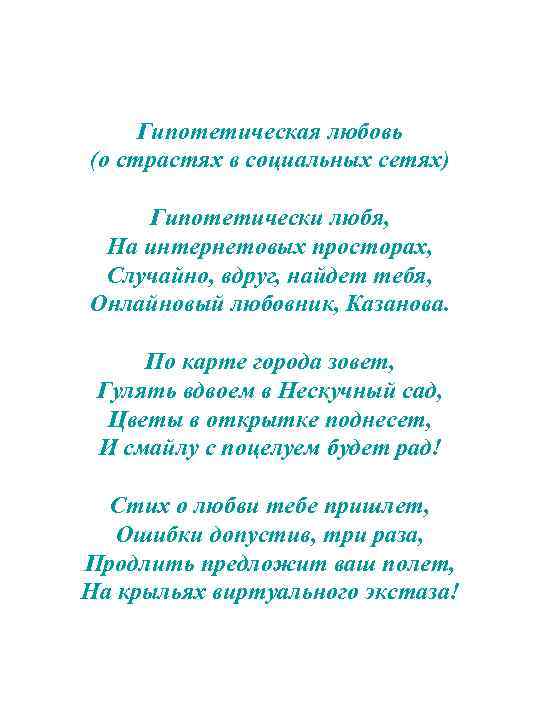 Гипотетическая любовь (о страстях в социальных сетях) Гипотетически любя, На интернетовых просторах, Случайно, вдруг, найдет тебя, Онлайновый любовник, Казанова. По карте города зовет, Гулять вдвоем в Нескучный сад, Цветы в открытке поднесет, И смайлу с поцелуем будет рад! Стих о любви тебе пришлет, Ошибки допустив, три раза, Продлить предложит ваш полет, На крыльях виртуального экстаза!