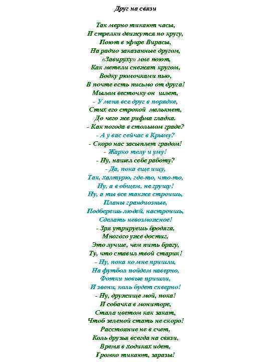 Друг на связи Так мерно тикают часы, И стрелки движутся по кругу, Поют в эфире Вирасы, На радио заказанные другом, «Завируху» мне поют, Как метели снежат кругом, Водку рюмочками пью, В почте есть письмо от друга! Мылом весточку он шлет, - У меня все друг в порядке, Стих его строкой мелькнет, До чего же рифма гладка. - Как погода в стольном граде? - А у вас сейчас в Крыму? - Скоро нас засыплет градом! - Жарко телу и уму! - Ну, нашел себе работу? - Да, пока еще ищу, Так, халтурю, где-то, что-то, Ну, а в общем, не грущу! Ну, а ты все также строишь, Планы грандиозные, Подберешь людей, настроишь, Сделать невозможное! - Зря утрируешь бродяга, Многого уже достиг, Это лучше, чем пить брагу, Ту, что ставил твой старик! - Ну, пока ко мне пришли, На футбол пойдем наверно, Фотки новые пришли, И звони, коль будет скверно! - Ну, дружище мой, пока! И собачка в мониторе, Стала цветом как закат, Чтоб зеленой стать не скоро! Расстояние не в счет, Коль друзья всегда на связи, Время в ходиках идет, Громко тикают, заразы!