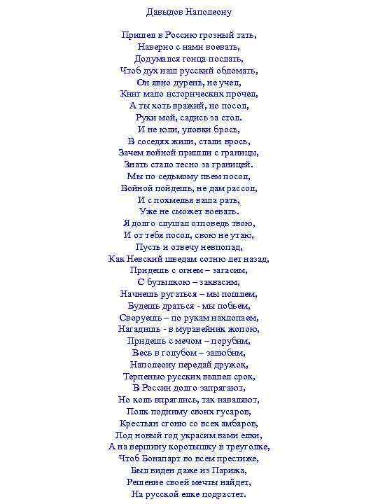 Давыдов Наполеону Пришел в Россию грозный тать, Наверно с нами воевать, Додумался гонца послать, Чтоб дух наш русский обломать, Он явно дурень, не учел, Книг мало исторических прочел, А ты хоть вражий, но посол, Руки мой, садись за стол. И не юли, уловки брось, В соседях жили, стали врось, Зачем войной пришли с границы, Знать стало тесно за границей. Мы по седьмому пьем посол, Войной пойдешь, не дам рассол, И с похмелья ваша рать, Уже не сможет воевать. Я долго слушал отповедь твою, И от тебя посол, свою не утаю, Пусть и отвечу невпопад, Как Невский шведам сотню лет назад, Придешь с огнем – загасим, С бутылкою – заквасим, Начнешь ругаться – мы пошлем, Будешь драться - мы побьем, Своруешь – по рукам нахлопаем, Нагадишь - в муравейник жопою, Придешь с мечом – порубим, Весь в голубом – залюбим, Наполеону передай дружок, Терпенью русских вышел срок, В России долго запрягают, Но коль впряглись, так наваляют, Полк подниму своих гусаров, Крестьян сгоню со всех амбаров, Под новый год украсим вами елки, А на вершину коротышку в треуголке, Чтоб Бонапарт во всем престиже, Был виден даже из Парижа, Решение своей мечты найдет, На русской елке подрастет.
