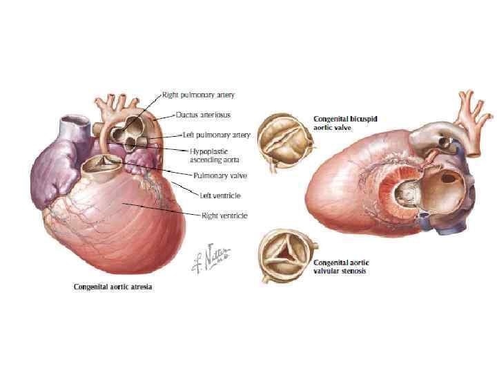 врожденный АС • Одностворчатый клапан вызывает выраженную обструкцию уже в грудном возрасте и (причина смерти детей до 1 года. ) Стеноз врожденного двухстворчатого клапана Врожденно-измененный трехстворчатый клапан приводит к появлению турбулентного тока крови, травмирующего створки клапана, что ведет к фиброзированию, увеличению жесткости и кальцификации створок характеризуется наличием неравномерных по размеру створок с признаками сращения по комиссурам. При этом турбулентный ток крови, вызванный умеренным врожденным дефектом, может приводить к фиброзу и, в конечном счете, – к кальцификации и АС.