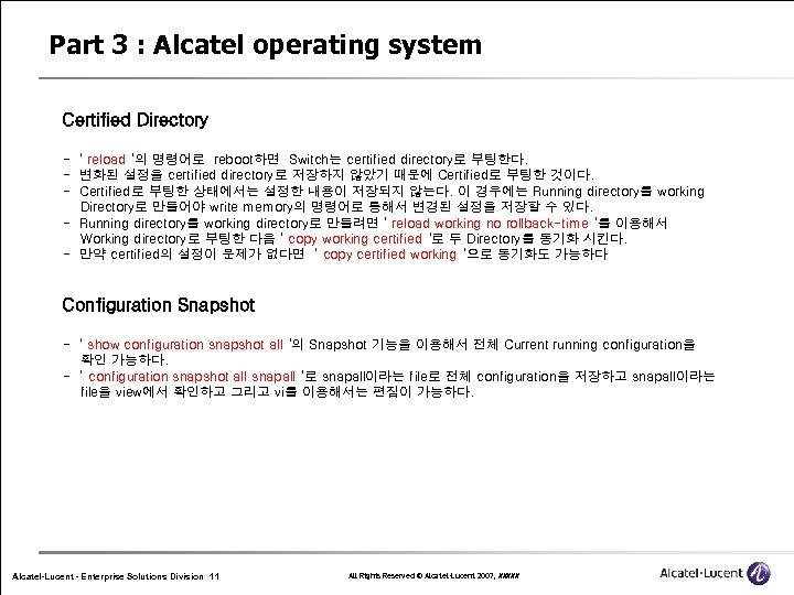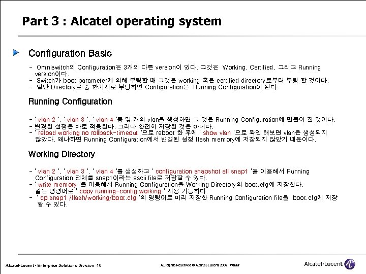 Part 3 : Alcatel operating system Configuration Basic - Omniswitch의 Configuration은 3개의 다른 version이 있다. 그것은 Working, Certified, 그리고 Running version이다. - Switch가 boot parameter에 의해 부팅할 때 그것은 working 혹은 certified directory로부터 부팅 할 것이다. - 일단 Directory로 중 한가지로 부팅하면 Configuration은 Running Configuration이 된다. Running Configuration - ‘ vlan 2 ’, ‘ vlan 3 ’, ‘ vlan 4 ’등 몇 개의 vlan을 생성하면 그 것은 Running Configuration에 만들어 진 것이다. - 변경된 설정은 바로 적용된다. 그러나 완전히 저장된 것은 아니다. - ‘ reload working no rollback-timeout ’으로 reboot 한 후에 ‘ show vlan ’으로 확인 해보면 vlan은 생성되지 않았다. 왜냐하면 Running Configuration에서 변경된 설정 flash memory에 저장되지 않았기 때문이다. Working Directory - ‘ vlan 2 ’, ‘ vlan 3 ’, ‘ vlan 4 ’를 생성하고 ‘ configuration snapshot all snap 1 ’을 이용해서 Running Configuration 전체를 snap 1이라는 ascii file로 저장할 수 있다. - ‘ write memory ’를 이용해서 Running Configuration을 Working Directory의 boot. cfg에 저장한다. 같은 명령어로 ‘ copy running-config working ’ 사용 가능하다. - ‘ cp snap 1 /flash/working/boot. cfg ’의 명령어로 미리 저장한 Running Configuration file을 boot. cfg에 저장 할 수 있다. Alcatel-Lucent - Enterprise Solutions Division 10 All Rights Reserved © Alcatel-Lucent 2007, #####