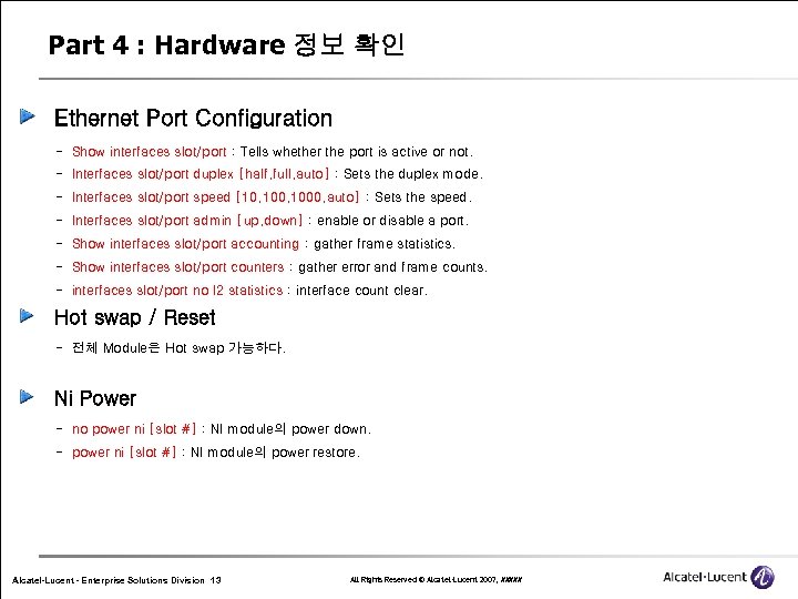 Part 4 : Hardware 정보 확인 Gathering Switch Information - show hardware info : Information on CPU, Memory, Miniboot. - show microcode : Code descriptions and versions. - show microcode history : List of upgrade path. - show chassis : Chassis type and part numbers. - show cmm : Processor and fabric board information. - show ni : Networking interface information. - show power : Power supply information. - show fan : Fan Information. - show temperature : Temperature and temperature threshold. CMM Redundancy - show cmm - reload secondary - reload primary - Primary CMM의 failover 시 실제 사용중인 Packet에 영향은 없다. - ‘ copy flash-synchro ’의 명령어로 Primary CMM의 Working, Certified directory를 Secondary CMM의 Working, Certified directory로 동기화 시킬 수 있다. Alcatel-Lucent - Enterprise Solutions Division 12 All Rights Reserved © Alcatel-Lucent 2007, #####