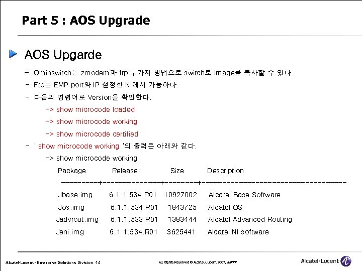 Part 5 : AOS Upgrade AOS Upgarde - Ominswitch는 zmodem과 ftp 두가지 방법으로 switch로 Image를 복사할 수 있다. - Ftp는 EMP port와 IP 설정한 NI에서 가능하다. - 다음의 명령어로 Version을 확인한다. -> show microcode loaded -> show microcode working -> show microcode certified - ‘ show microcode working ’의 출력은 아래와 같다. -> show microcode working Package Release Size Description ---------+--------+-----------------Jbase. img 6. 1. 1. 534. R 01 10927002 Alcatel Base Software Jos. img 6. 1. 1. 534. R 01 1843725 Alcatel OS Jadvrout. img 6. 1. 1. 533. R 01 1383444 Alcatel Advanced Routing Jeni. img 6. 1. 1. 534. R 01 3625441 Alcatel NI software Alcatel-Lucent - Enterprise Solutions Division 14 All Rights Reserved © Alcatel-Lucent 2007, #####