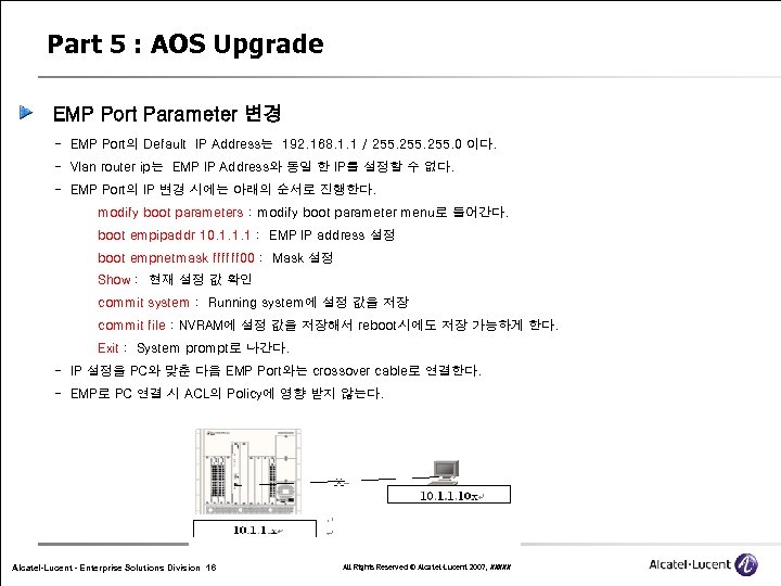 Part 5 : AOS Upgrade EMP Port Parameter 변경 - EMP Port의 Default IP Address는 192. 168. 1. 1 / 255. 0 이다. - Vlan router ip는 EMP IP Address와 동일 한 IP를 설정할 수 없다. - EMP Port의 IP 변경 시에는 아래의 순서로 진행한다. modify boot parameters : modify boot parameter menu로 들어간다. boot empipaddr 10. 1. 1. 1 : EMP IP address 설정 boot empnetmask ffffff 00 : Mask 설정 Show : 현재 설정 값 확인 commit system : Running system에 설정 값을 저장 commit file : NVRAM에 설정 값을 저장해서 reboot시에도 저장 가능하게 한다. Exit : System prompt로 나간다. - IP 설정을 PC와 맞춘 다음 EMP Port와는 crossover cable로 연결한다. - EMP로 PC 연결 시 ACL의 Policy에 영향 받지 않는다. Alcatel-Lucent - Enterprise Solutions Division 16 All Rights Reserved © Alcatel-Lucent 2007, #####