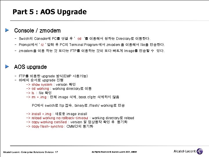 Part 5 : AOS Upgrade Console / zmodem - Switch의 Console에 PC를 연결 후 ‘ cd ’를 이용해서 원하는 Directory로 이동한다. - Prompt에서 ‘ rz ’ 입력 후 PC의 Terminal Program에서 zmodem을 이용해서 file을 전송한다. - zmodem을 이용 하는 것 보다는 FTP를 이용하는 것이 보다 빠르게 Image를 전송할 수 있다. AOS upgrade - FTP를 이용한 upgrade 방식(EMP 사용가능) - 아래의 순서로 upgrade 진행 -> show system : version 확인 -> cd working : working directory로 이동 -> ls : file 확인 -> rm *. img : 전체 image 삭제, boot. cfg는 삭제하지 않음 PC에서 switch로 ftp 접속, binary로 /flash/ working로 전송 -> -> install *. img : 새로운 image install reload working no rollback-timeout : working directory로 reload copy working certified : version 및 정상동작 확인 후 동기화 copy flash-synchro : CMM간의 동기화 Alcatel-Lucent - Enterprise Solutions Division 17 All Rights Reserved © Alcatel-Lucent 2007, #####