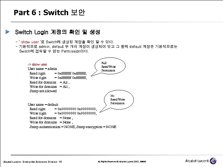 Part 6 : Switch 보안 Switch Login 계정의 확인 및 생성 - ‘ show user ’로 Switch에 생성된 계정을 확인 할 수 있다. - 기본적으로 admin, default 두 개의 계정이 생성되어 있고 그 중에 default 계정은 기본적으로는 Switch에 접속할 수 없는 Permission이다. -> show user User name = admin Read right = 0 xffffffff, Write right = 0 xffffffff, Read for domains = All , Write for domains = All , Snmp not allowed Full Read/Write Permission No Read/Write Permission User name = default Read right = 0 x 00000000, Write right = 0 x 00000000, Read for domains = None , Write for domains = None , Snmp authentication = NONE, Snmp encryption = NONE Alcatel-Lucent - Enterprise Solutions Division 18 All Rights Reserved © Alcatel-Lucent 2007, #####