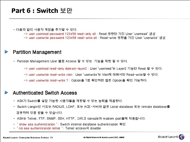 Part 6 : Switch 보안 - 다음과 같이 사용자 계정을 추가할 수 있다. -> userread password 123456 read-only all : Read 권한만 가진 User ‘userread’ 생성 -> userwrite password 123456 read-write all : Read-write 권한을 가진 User ‘userwrite’ 생성 Partition Management - Partition Management User 별로 Access 할 수 있는 기능을 제한 할 수 있다. -> userread-only domain-layer 2 : User ‘userread’는 Layer 2 기능만 Read 할 수 있다. -> userwrite read-write vlan : User ‘userwrite’는 Vlan에 대해서만 Read-write할 수 있다. -> userwrite read-write ? : Option을 ? 로 확인하면 많은 Option을 확인 가능하다. Authenticated Switch Access - ASA가 Switch를 설정 가능한 사용자들을 제한할 수 있는 능력을 제공한다. - Switch Longin인 시도는 RADIUS, LDAP, 또는 ACE-서버와 같은 Local database 또는 remote database를 경유하여 인증 받을 수 있습니다. - ASA는 Telnet, FTP, SNMP, SSH, HTTP, 그리고 console과 modem port들에 적용됩니다. - ‘ show aaa authentication ’ : Switch internal database authentication 확인 - ‘ no aaa authentication telnet ’ : Telnet access의 disable Alcatel-Lucent - Enterprise Solutions Division 19 All Rights Reserved © Alcatel-Lucent 2007, #####