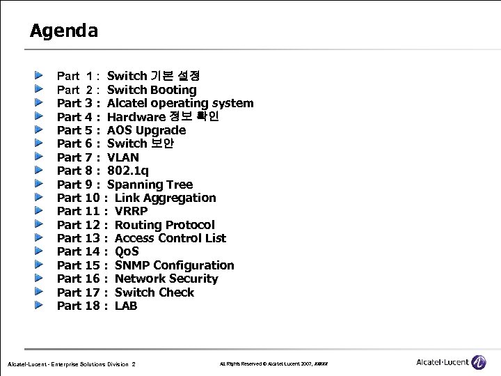 Agenda Part 1 : Switch 기본 설정 Part 2 : Switch Booting Part 3 : Alcatel operating system Part 4 : Hardware 정보 확인 Part 5 : AOS Upgrade Part 6 : Switch 보안 Part 7 : VLAN Part 8 : 802. 1 q Part 9 : Spanning Tree Part 10 : Link Aggregation Part 11 : VRRP Part 12 : Routing Protocol Part 13 : Access Control List Part 14 : Qo. S Part 15 : SNMP Configuration Part 16 : Network Security Part 17 : Switch Check Part 18 : LAB Alcatel-Lucent - Enterprise Solutions Division 2 All Rights Reserved © Alcatel-Lucent 2007, #####
