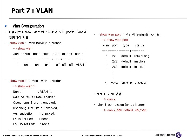 Part 7 : VLAN Vlan Configuration - 처음에는 Default vlan 1만 존재하며 모든 port는 vlan 1에 할당되어 있음 -> show vlan port - ' show vlan ' : Vlan basic information vlan -> show vlan admin port type status ----+----+------oper stree auth ip ipx name ----+-----+----+--+----1 - ' show vlan port ' : Vlan에 assign된 port list on on on off off VLAN 1 1 2/1 default forwarding 1 2/2 default inactive 1 2/3 default inactive : : - ' show vlan 1 ' : Vlan 1의 information 1 2/24 default inactive -> show vlan 1 Name : VLAN 1, Administrative State: enabled, Operational State : enabled, Spanning Tree State : enabled, Authentication - vlan에 port assign (untag frame) -> vlan 2 port default slot/port : none, IPX Router Port -> vlan 2 : disabled, IP Router Port - 새로운 vlan 생성 : none Alcatel-Lucent - Enterprise Solutions Division 20 All Rights Reserved © Alcatel-Lucent 2007, #####