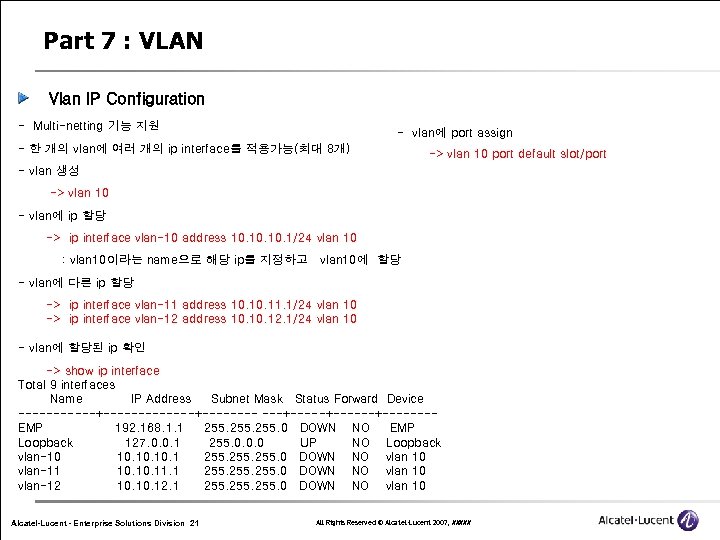 Part 7 : VLAN Vlan IP Configuration - Multi-netting 기능 지원 - vlan에 port assign - 한 개의 vlan에 여러 개의 ip interface를 적용가능(최대 8개) -> vlan 10 port default slot/port - vlan 생성 -> vlan 10 - vlan에 ip 할당 -> ip interface vlan-10 address 10. 10. 1/24 vlan 10 : vlan 10이라는 name으로 해당 ip를 지정하고 vlan 10에 할당 - vlan에 다른 ip 할당 -> ip interface vlan-11 address 10. 11. 1/24 vlan 10 -> ip interface vlan-12 address 10. 12. 1/24 vlan 10 - vlan에 할당된 ip 확인 -> show ip interface Total 9 interfaces Name IP Address Subnet Mask Status Forward Device -----------+-------- ---+------+-------EMP 192. 168. 1. 1 255. 0 DOWN NO EMP Loopback 127. 0. 0. 1 255. 0. 0. 0 UP NO Loopback vlan-10 10. 10. 1 255. 0 DOWN NO vlan 10 vlan-11 10. 11. 1 255. 0 DOWN NO vlan 10 vlan-12 10. 12. 1 255. 0 DOWN NO vlan 10 Alcatel-Lucent - Enterprise Solutions Division 21 All Rights Reserved © Alcatel-Lucent 2007, #####