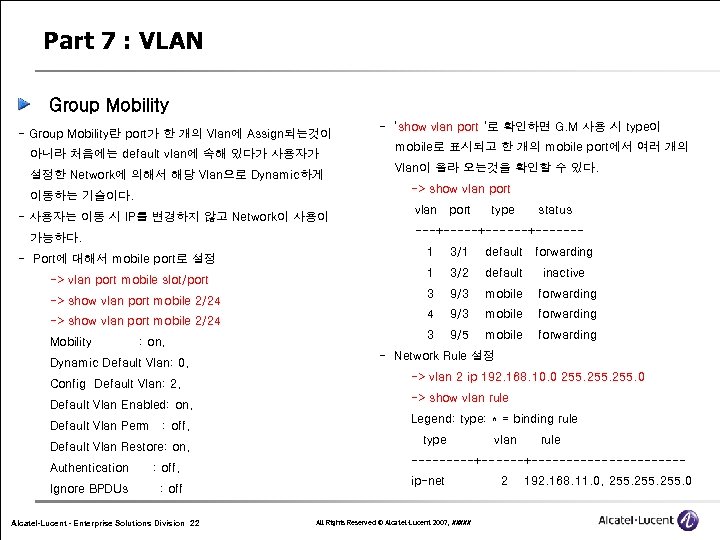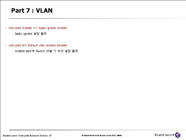 Part 7 : VLAN - vlan port mobile 1/1 bpdu ignore enable : bpdu ignore 설정 필요 - vlan port 9/1 default vlan restore disable : mobile port에 Switch 연결 시 위의 설정 필요 Alcatel-Lucent - Enterprise Solutions Division 23 All Rights Reserved © Alcatel-Lucent 2007, #####