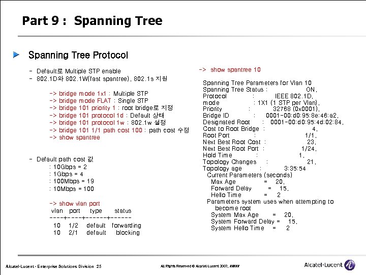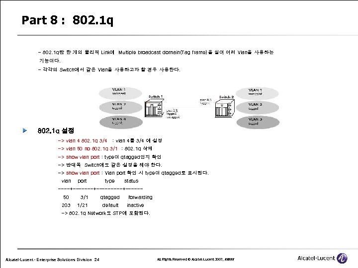 Part 8 : 802. 1 q - 802. 1 q란 한 개의 물리적 Link에 Multiple broadcast domain(Tag frame)을 실어 여러 Vlan을 사용하는 기능이다. - 각각의 Switch에서 같은 Vlan을 사용하고자 할 경우 사용한다. 802. 1 q 설정 -> vlan 4 802. 1 q 3/4 : vlan 4를 3/4 에 설정 -> vlan 50 no 802. 1 q 3/1 : 802. 1 q 삭제 -> show vlan port : type이 qtagged인지 확인 -> 반대쪽 Switch에도 같은 설정을 해야 한다. -> show vlan port : Vlan port 확인 시 type이 qtagged로 표시된다. vlan port type status ----+---------+-----50 3/1 qtagged 203 1/21 default forwarding inactive -> 802. 1 q Network도 STP에 포함된다. Alcatel-Lucent - Enterprise Solutions Division 24 All Rights Reserved © Alcatel-Lucent 2007, #####