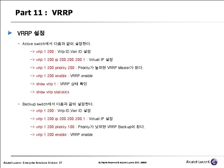 Part 11 : VRRP 설정 - Active switch에서 다음과 같이 설정한다. -> vrrp 1 200 : Vrrp ID, Van ID 설정 -> vrrp 1 200 ip 200. 1 : Virtual IP 설정 -> vrrp 1 200 priority 200 : Priority가 높으면 VRRP Master가 된다. -> vrrp 1 200 enable : VRRP enable -> show vrrp 1 : VRRP 상태 확인 -> show vrrp statistics - Backup switch에서 다음과 같이 설정한다. -> vrrp 1 200 : Vrrp ID, Van ID 설정 -> vrrp 1 200 ip 200. 1 : Virtual IP 설정 -> vrrp 1 200 priority 100 : Priority가 낮으면 VRRP Backup이 된다. -> vrrp 1 200 enable : VRRP enable Alcatel-Lucent - Enterprise Solutions Division 27 All Rights Reserved © Alcatel-Lucent 2007, #####