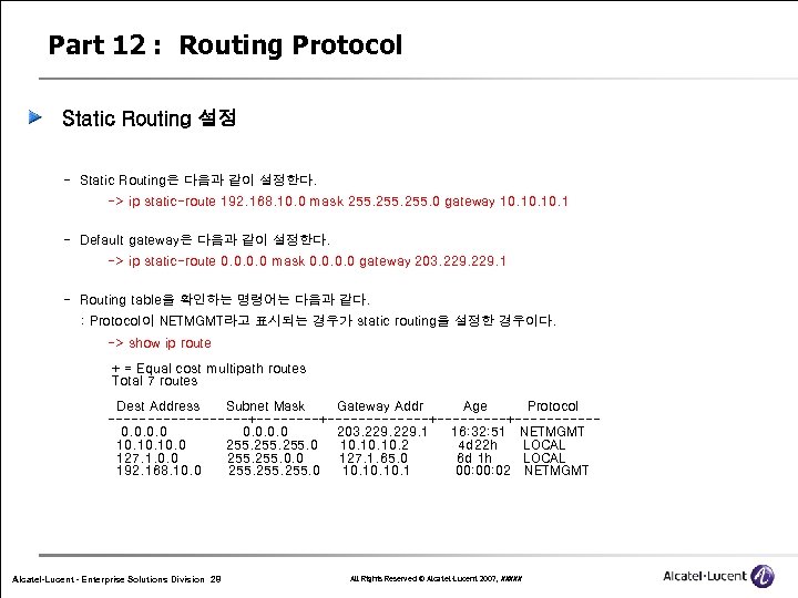 Part 12 : Routing Protocol Static Routing 설정 - Static Routing은 다음과 같이 설정한다. -> ip static-route 192. 168. 10. 0 mask 255. 0 gateway 10. 10. 1 - Default gateway은 다음과 같이 설정한다. -> ip static-route 0. 0 mask 0. 0 gateway 203. 229. 1 - Routing table을 확인하는 명령어는 다음과 같다. : Protocol이 NETMGMT라고 표시되는 경우가 static routing을 설정한 경우이다. -> show ip route + = Equal cost multipath routes Total 7 routes Dest Address Subnet Mask Gateway Addr Age Protocol ---------+-------------+----------0. 0 203. 229. 1 16: 32: 51 NETMGMT 10. 10. 0 255. 0 10. 10. 2 4 d 22 h LOCAL 127. 1. 0. 0 255. 0. 0 127. 1. 65. 0 6 d 1 h LOCAL 192. 168. 10. 0 255. 0 10. 10. 1 00: 02 NETMGMT Alcatel-Lucent - Enterprise Solutions Division 28 All Rights Reserved © Alcatel-Lucent 2007, #####