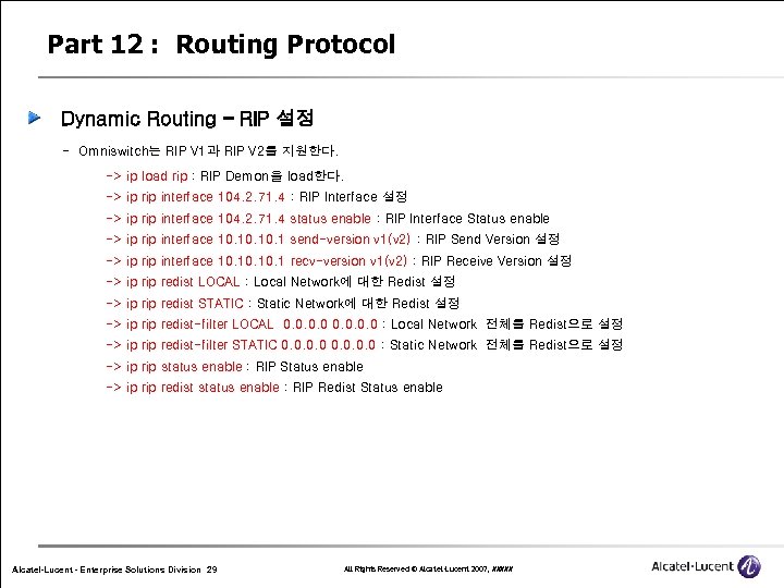 Part 12 : Routing Protocol Dynamic Routing – RIP 설정 - Omniswitch는 RIP V 1과 RIP V 2를 지원한다. -> ip load rip : RIP Demon을 load한다. -> ip rip interface 104. 2. 71. 4 : RIP Interface 설정 -> ip rip interface 104. 2. 71. 4 status enable : RIP Interface Status enable -> ip rip interface 10. 10. 1 send-version v 1(v 2) : RIP Send Version 설정 -> ip rip interface 10. 10. 1 recv-version v 1(v 2) : RIP Receive Version 설정 -> ip redist LOCAL : Local Network에 대한 Redist 설정 -> ip redist STATIC : Static Network에 대한 Redist 설정 -> ip redist-filter LOCAL 0. 0 : Local Network 전체를 Redist으로 설정 -> ip redist-filter STATIC 0. 0 : Static Network 전체를 Redist으로 설정 -> ip rip status enable : RIP Status enable -> ip redist status enable : RIP Redist Status enable Alcatel-Lucent - Enterprise Solutions Division 29 All Rights Reserved © Alcatel-Lucent 2007, #####