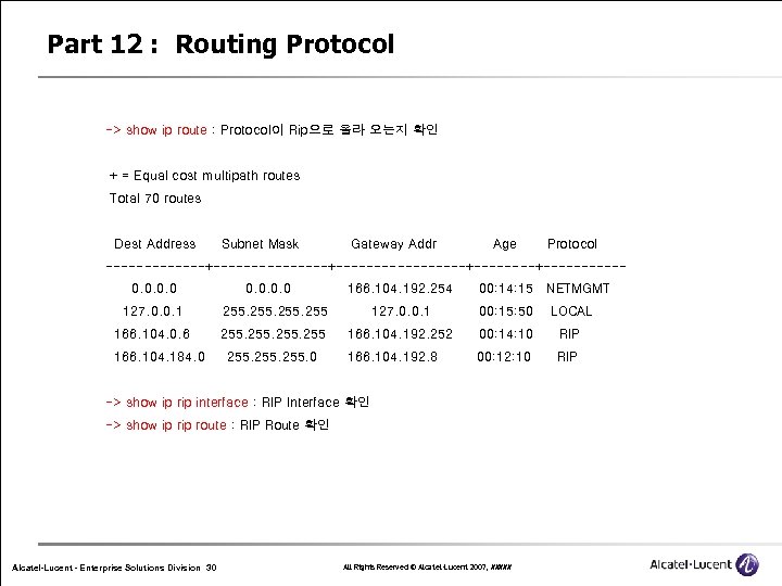 Part 12 : Routing Protocol -> show ip route : Protocol이 Rip으로 올라 오는지 확인 + = Equal cost multipath routes Total 70 routes Dest Address Subnet Mask Gateway Addr Age Protocol -------------+----------+----------0. 0 166. 104. 192. 254 00: 14: 15 NETMGMT 127. 0. 0. 1 255 127. 0. 0. 1 00: 15: 50 LOCAL 166. 104. 0. 6 255 166. 104. 192. 252 00: 14: 10 RIP 166. 104. 192. 8 00: 12: 10 RIP 166. 104. 184. 0 255. 0 -> show ip rip interface : RIP Interface 확인 -> show ip route : RIP Route 확인 Alcatel-Lucent - Enterprise Solutions Division 30 All Rights Reserved © Alcatel-Lucent 2007, #####