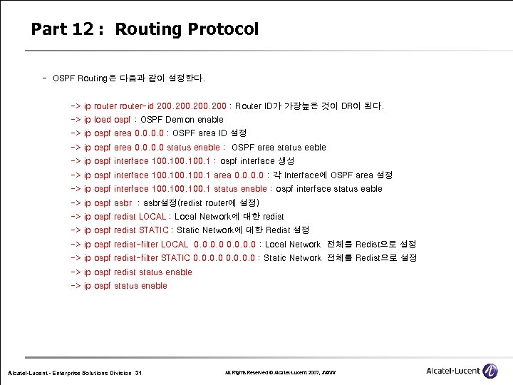 Part 12 : Routing Protocol - OSPF Routing은 다음과 같이 설정한다. -> ip router-id 200 : Router ID가 가장높은 것이 DR이 된다. -> ip load ospf : OSPF Demon enable -> ip ospf area 0. 0 : OSPF area ID 설정 -> ip ospf area 0. 0 status enable : OSPF area status eable -> ip ospf interface 100. 1 : ospf interface 생성 -> ip ospf interface 100. 1 area 0. 0 : 각 Interface에 OSPF area 설정 -> ip ospf interface 100. 1 status enable : ospf interface status eable -> ip ospf asbr : asbr설정(redist router에 설정) -> ip ospf redist LOCAL : Local Network에 대한 redist -> ip ospf redist STATIC : Static Network에 대한 Redist 설정 -> ip ospf redist-filter LOCAL 0. 0 : Local Network 전체를 Redist으로 설정 -> ip ospf redist-filter STATIC 0. 0 : Static Network 전체를 Redist으로 설정 -> ip ospf redist status enable -> ip ospf status enable Alcatel-Lucent - Enterprise Solutions Division 31 All Rights Reserved © Alcatel-Lucent 2007, #####
