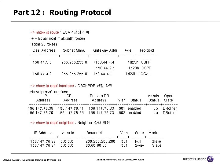 Part 12 : Routing Protocol -> show ip route : ECMP 생성의 예 + = Equal cost multipath routes Total 26 routes Dest Address Subnet Mask Gateway Addr Age Protocol -------+-------+----------158. 44. 3. 0 255. 0 +158. 44. 4. 4 1 d 23 h OSPF +158. 44. 9. 1 158. 44. 4. 0 255. 0 1 d 23 h OSPF 158. 44. 4. 1 1 d 23 h LOCAL -> show ip ospf interface : DR과 BDR 선정 확인 show ip ospf interface IP DR Backup DR Admin Oper Address Vlan Status State ------------+-------+--------+------156. 147. 76. 38 156. 147. 76. 41 156. 147. 76. 33 501 enabled up DRother 156. 147. 76. 70 156. 147. 76. 65 156. 147. 76. 73 502 enabled up DRother -> show ip ospf neighbor : Neighbor 상태 확인 IP Address Area Id Router Id Vlan State Mode ------+----------------+-------+-------156. 147. 76. 33 0. 0 200 501 Full Slave 156. 147. 76. 34 0. 0 60. 60. 60 501 2 way Slave Alcatel-Lucent - Enterprise Solutions Division 32 All Rights Reserved © Alcatel-Lucent 2007, #####