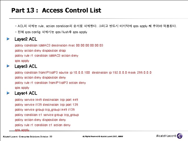 Part 13 : Access Control List - ACL의 삭제는 rule, action condition의 순서로 삭제한다. 그리고 반드시 마지막에 qos apply 해 주어야 적용된다. - 전체 qos config 삭제시는 qos flush후 qos apply Layer 2 ACL policy condition to. MAC 3 destination mac 00: 00: 00: 03 policy action deny disposition drop policy rule r 1 condition to. MAC 3 action deny qos apply Layer 3 ACL policy condition from. IP 1 to. IP 3 source ip 10. 0. 0. 100 destination ip 192. 0. 0. 0 mask 255. 0. 0. 0 policy action deny disposition deny policy rule r 1 condition from. IP 1 to. IP 3 action deny qos apply Layer 4 ACL policy service t 445 destination tcp port 445 policy service t 135 destination tcp port 135 policy service group tcp_group t 445 t 135 policy condition c 1 service group tcp_group policy action deny disposition deny policy rule r 1 condition c 1 action deny qos apply Alcatel-Lucent - Enterprise Solutions Division 33 All Rights Reserved © Alcatel-Lucent 2007, #####