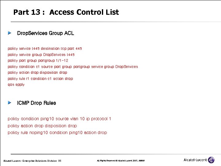 Part 13 : Access Control List Drop. Services Group ACL policy service t 445 destination tcp port 445 policy service group Drop. Services t 445 policy port group portgroup 1/1 -12 policy condition c 1 source port group portgroup service group Drop. Services policy action drop disposition drop policy rule r 1 condition c 1 action drop qos apply ICMP Drop Rules policy condition ping 10 source vlan 10 ip protocol 1 policy action drop disposition drop policy rule noping 10 condition ping 10 action drop Alcatel-Lucent - Enterprise Solutions Division 35 All Rights Reserved © Alcatel-Lucent 2007, #####