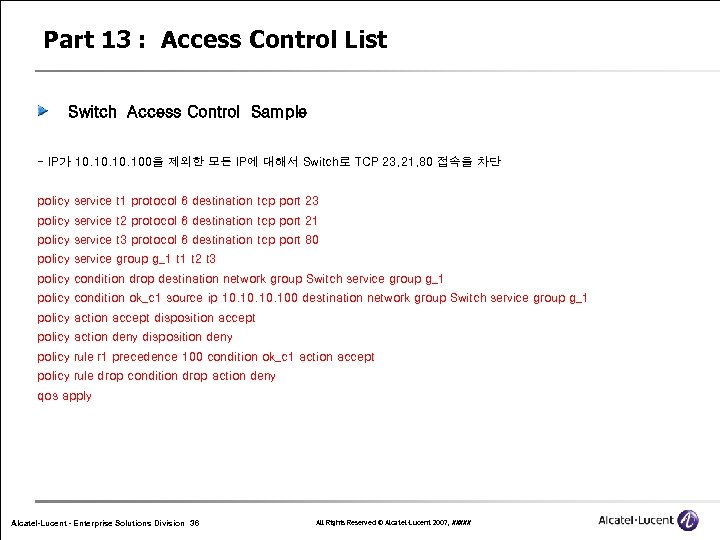 Part 13 : Access Control List Switch Access Control Sample - IP가 10. 10. 100을 제외한 모든 IP에 대해서 Switch로 TCP 23, 21, 80 접속을 차단 policy service t 1 protocol 6 destination tcp port 23 policy service t 2 protocol 6 destination tcp port 21 policy service t 3 protocol 6 destination tcp port 80 policy service group g_1 t 2 t 3 policy condition drop destination network group Switch service group g_1 policy condition ok_c 1 source ip 10. 10. 100 destination network group Switch service group g_1 policy action accept disposition accept policy action deny disposition deny policy rule r 1 precedence 100 condition ok_c 1 action accept policy rule drop condition drop action deny qos apply Alcatel-Lucent - Enterprise Solutions Division 36 All Rights Reserved © Alcatel-Lucent 2007, #####