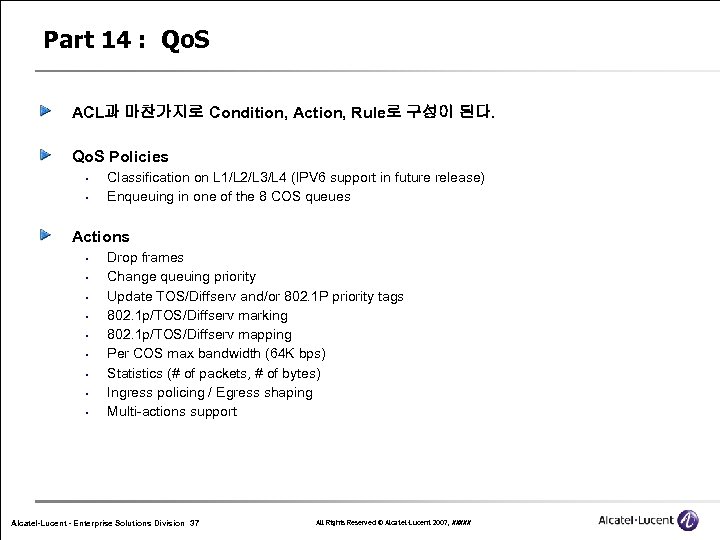 Part 14 : Qo. S ACL과 마찬가지로 Condition, Action, Rule로 구성이 된다. Qo. S Policies • • Classification on L 1/L 2/L 3/L 4 (IPV 6 support in future release) Enqueuing in one of the 8 COS queues Actions • • • Drop frames Change queuing priority Update TOS/Diffserv and/or 802. 1 P priority tags 802. 1 p/TOS/Diffserv marking 802. 1 p/TOS/Diffserv mapping Per COS max bandwidth (64 K bps) Statistics (# of packets, # of bytes) Ingress policing / Egress shaping Multi-actions support Alcatel-Lucent - Enterprise Solutions Division 37 All Rights Reserved © Alcatel-Lucent 2007, #####