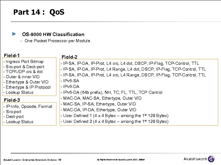 Part 14 : Qo. S OS-9000 HW Classification - One Packet Processor per Module Field-1 - Ingress Port Bitmap - Src-port & Dest-port - TCP/UDP src & dst - Outer & inner VID - Ethertype & Outer VID - Ethertype & IP Protocol - Lookup Status Field-3 - IP-Info, Opcode, Format - Src-port - Dest-port - Lookup Status Field-2 - IP-SA, IP-DA, IP-Prot, L 4 src, L 4 dst, DSCP, IP-Flag, TCP-Control, TTL - IP-SA, IP-DA, IP-Prot, L 4 Range, L 4 dst, DSCP, IP-Flag, TCP-Control, TTL - IP-SA, IP-DA, IP-Prot, L 4 src, L 4 Range, DSCP, IP-Flag, TCP-Control, TTL - IPv 6 -SA - IPv 6 -DA (64 b prefix), NH, TC, FL, TTL, TCP Control - MAC-DA, MAC-SA, Ethertype, Outer VID - MAC-SA, IP-SA, Ethertype, Outer VID - MAC-DA, IP-DA, Ethertype, Outer VID - User Defined 1 (4 x 4 Bytes – among the 1 st 128 Bytes) - User Defined 2 (4 x 4 Bytes – among the 1 st 128 Bytes) Alcatel-Lucent - Enterprise Solutions Division 38 All Rights Reserved © Alcatel-Lucent 2007, #####