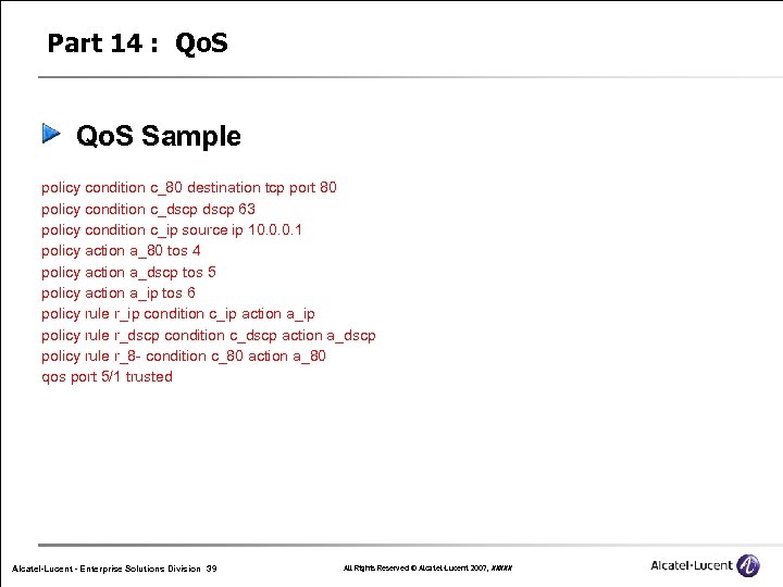 Part 14 : Qo. S Sample policy condition c_80 destination tcp port 80 policy condition c_dscp 63 policy condition c_ip source ip 10. 0. 0. 1 policy action a_80 tos 4 policy action a_dscp tos 5 policy action a_ip tos 6 policy rule r_ip condition c_ip action a_ip policy rule r_dscp condition c_dscp action a_dscp policy rule r_8 - condition c_80 action a_80 qos port 5/1 trusted Alcatel-Lucent - Enterprise Solutions Division 39 All Rights Reserved © Alcatel-Lucent 2007, #####