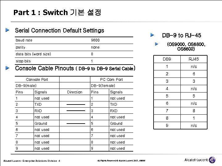Part 1 : Switch 기본 설정 Serial Connection Default Settings baud rate parity none data bits (word size) 8 stop bits DB-9 to RJ-45 9600 1 (OS 9000, OS 6800, OS 6602) ( DB-9 to DB-9 Serial Cable) Console Port PC Com Port DB-9(male) Pins Signals 1 DB-9(female) 1 n/c 6 3 3 4 n/c Pins Signals not used 1 not used 5 5 2 TXD 6 n/c 3 RXD 7 8 4 not used 8 1 5 Ground 6 not used 9 n/c 7 not used 8 not used 9 not used Alcatel-Lucent - Enterprise Solutions Division 4 Direction RJ 45 2 Console Cable Pinouts DB 9 All Rights Reserved © Alcatel-Lucent 2007, #####