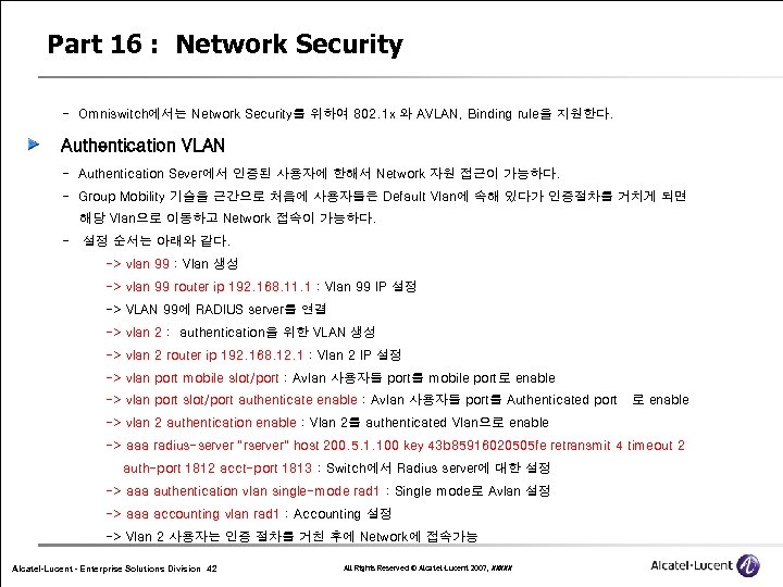 Part 16 : Network Security - Omniswitch에서는 Network Security를 위하여 802. 1 x 와 AVLAN, Binding rule을 지원한다. Authentication VLAN - Authentication Sever에서 인증된 사용자에 한해서 Network 자원 접근이 가능하다. - Group Mobility 기술을 근간으로 처음에 사용자들은 Default Vlan에 속해 있다가 인증절차를 거치게 되면 해당 Vlan으로 이동하고 Network 접속이 가능하다. - 설정 순서는 아래와 같다. -> vlan 99 : Vlan 생성 -> vlan 99 router ip 192. 168. 11. 1 : Vlan 99 IP 설정 -> VLAN 99에 RADIUS server를 연결 -> vlan 2 : authentication을 위한 VLAN 생성 -> vlan 2 router ip 192. 168. 12. 1 : Vlan 2 IP 설정 -> vlan port mobile slot/port : Avlan 사용자들 port를 mobile port로 enable -> vlan port slot/port authenticate enable : Avlan 사용자들 port를 Authenticated port 로 enable -> vlan 2 authentication enable : Vlan 2를 authenticated Vlan으로 enable -> aaa radius-server "rserver" host 200. 5. 1. 100 key 43 b 85916020505 fe retransmit 4 timeout 2 auth-port 1812 acct-port 1813 : Switch에서 Radius server에 대한 설정 -> aaa authentication vlan single-mode rad 1 : Single mode로 Avlan 설정 -> aaa accounting vlan rad 1 : Accounting 설정 -> Vlan 2 사용자는 인증 절차를 거친 후에 Network에 접속가능 Alcatel-Lucent - Enterprise Solutions Division 42 All Rights Reserved © Alcatel-Lucent 2007, #####