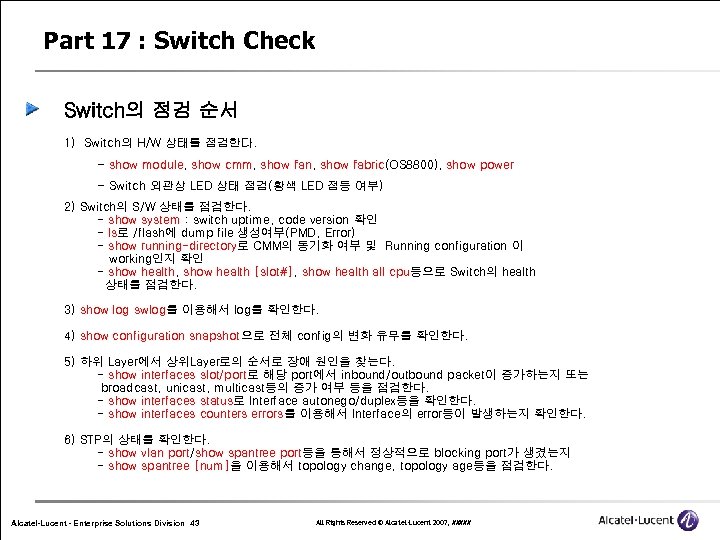 Part 17 : Switch Check Switch의 점검 순서 1) Switch의 H/W 상태를 점검한다. - show module, show cmm, show fan, show fabric(OS 8800), show power - Switch 외관상 LED 상태 점검(황색 LED 점등 여부) 2) Switch의 S/W 상태를 점검한다. - show system : switch uptime, code version 확인 - ls로 /flash에 dump file 생성여부(PMD, Error) - show running-directory로 CMM의 동기화 여부 및 Running configuration 이 working인지 확인 - show health, show health [slot#], show health all cpu등으로 Switch의 health 상태를 점검한다. 3) show log swlog를 이용해서 log를 확인한다. 4) show configuration snapshot으로 전체 config의 변화 유무를 확인한다. 5) 하위 Layer에서 상위Layer로의 순서로 장애 원인을 찾는다. - show interfaces slot/port로 해당 port에서 inbound/outbound packet이 증가하는지 또는 broadcast, unicast, multicast등의 증가 여부 등을 점검한다. - show interfaces status로 Interface autonego/duplex등을 확인한다. - show interfaces counters errors를 이용해서 Interface의 error등이 발생하는지 확인한다. 6) STP의 상태를 확인한다. - show vlan port/show spantree port등을 통해서 정상적으로 blocking port가 생겼는지 - show spantree [num]을 이용해서 topology change, topology age등을 점검한다. Alcatel-Lucent - Enterprise Solutions Division 43 All Rights Reserved © Alcatel-Lucent 2007, #####