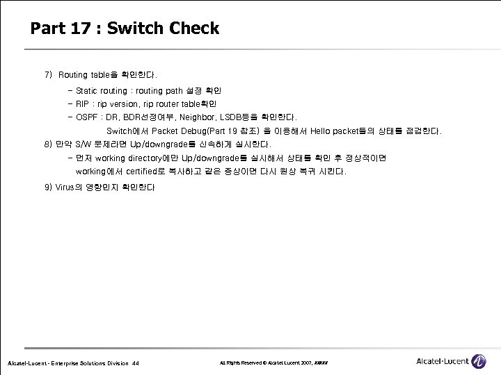 Part 17 : Switch Check 7) Routing table을 확인한다. - Static routing : routing path 설정 확인 - RIP : rip version, rip router table확인 - OSPF : DR, BDR선정여부, Neighbor, LSDB등을 확인한다. Switch에서 Packet Debug(Part 19 참조) 을 이용해서 Hello packet들의 상태를 점검한다. 8) 만약 S/W 문제라면 Up/downgrade를 신속하게 실시한다. - 먼저 working directory에만 Up/downgrade를 실시해서 상태를 확인 후 정상적이면 working에서 certified로 복사하고 같은 증상이면 다시 원상 복귀 시킨다. 9) Virus의 영향인지 확인한다 Alcatel-Lucent - Enterprise Solutions Division 44 All Rights Reserved © Alcatel-Lucent 2007, #####