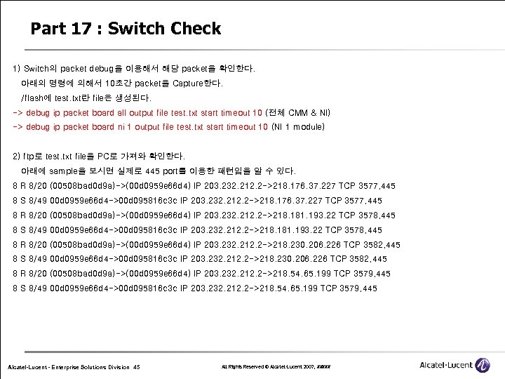 Part 17 : Switch Check 1) Switch의 packet debug을 이용해서 해당 packet을 확인한다. 아래의 명령에 의해서 10초간 packet을 Capture한다. /flash에 test. txt란 file은 생성된다. -> debug ip packet board all output file test. txt start timeout 10 (전체 CMM & NI) -> debug ip packet board ni 1 output file test. txt start timeout 10 (NI 1 module) 2) ftp로 test. txt file을 PC로 가져와 확인한다. 아래에 sample을 보시면 실제로 445 port를 이용한 패턴임을 알 수 있다. 8 R 8/20 (00508 bad 0 d 9 a)->(00 d 0959 e 66 d 4) IP 203. 232. 212. 2 ->218. 176. 37. 227 TCP 3577, 445 8 S 8/49 00 d 0959 e 66 d 4 ->00 d 095816 c 3 c IP 203. 232. 212. 2 ->218. 176. 37. 227 TCP 3577, 445 8 R 8/20 (00508 bad 0 d 9 a)->(00 d 0959 e 66 d 4) IP 203. 232. 212. 2 ->218. 181. 193. 22 TCP 3578, 445 8 S 8/49 00 d 0959 e 66 d 4 ->00 d 095816 c 3 c IP 203. 232. 212. 2 ->218. 181. 193. 22 TCP 3578, 445 8 R 8/20 (00508 bad 0 d 9 a)->(00 d 0959 e 66 d 4) IP 203. 232. 212. 2 ->218. 230. 206. 226 TCP 3582, 445 8 S 8/49 00 d 0959 e 66 d 4 ->00 d 095816 c 3 c IP 203. 232. 212. 2 ->218. 230. 206. 226 TCP 3582, 445 8 R 8/20 (00508 bad 0 d 9 a)->(00 d 0959 e 66 d 4) IP 203. 232. 212. 2 ->218. 54. 65. 199 TCP 3579, 445 8 S 8/49 00 d 0959 e 66 d 4 ->00 d 095816 c 3 c IP 203. 232. 212. 2 ->218. 54. 65. 199 TCP 3579, 445 Alcatel-Lucent - Enterprise Solutions Division 45 All Rights Reserved © Alcatel-Lucent 2007, #####