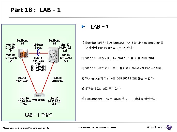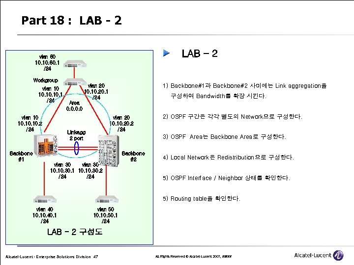 Part 18 : LAB - 1 LAB – 1 Backbone #1 vlan 10 10. 10. 1 /24 vlan 20 10. 20. 2 /24 Linkagg 2 port Backbone #2 vlan 10 10. 10. 2 /24 vlan 20 10. 20. 1 /24 802. 1 q Vlan 10, 20 VRRP 10. 10. 254 10. 20. 254 1) Backbone#1과 Backbone#2 사이에는 Link aggregation을 구성하여 Bandwidth를 확장 시킨다. 2) Vlan 10, 20을 전체 Switch에서 사용 가능 해야 한다. 3) Vlan 10, 20은 VRRP로 구성하여 Gateway를 Backup한다. 802. 1 q Vlan 10, 20 4) Workgroup의 Traffic은 OS 7800#1, 2로 분산 시킨다. 5) STP는 802. 1 w로 구성한다. vlan 10 Workgroup 10. 10. 3 /24 vlan 20 10. 20. 3 /24 6) Backbone#1 Power Down 후 VRRP 상태를 확인한다. LAB - 1 구성도 Alcatel-Lucent - Enterprise Solutions Division 46 All Rights Reserved © Alcatel-Lucent 2007, #####