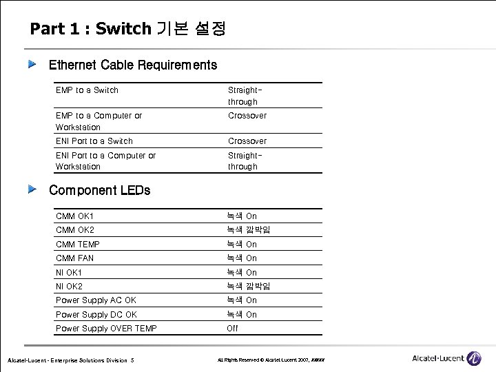 Part 1 : Switch 기본 설정 Ethernet Cable Requirements EMP to a Switch Straightthrough EMP to a Computer or Workstation Crossover ENI Port to a Switch Crossover ENI Port to a Computer or Workstation Straightthrough Component LEDs CMM OK 1 녹색 On CMM OK 2 녹색 깜박임 CMM TEMP 녹색 On CMM FAN 녹색 On NI OK 1 녹색 On NI OK 2 녹색 깜박임 Power Supply AC OK 녹색 On Power Supply DC OK 녹색 On Power Supply OVER TEMP Off Alcatel-Lucent - Enterprise Solutions Division 5 All Rights Reserved © Alcatel-Lucent 2007, #####