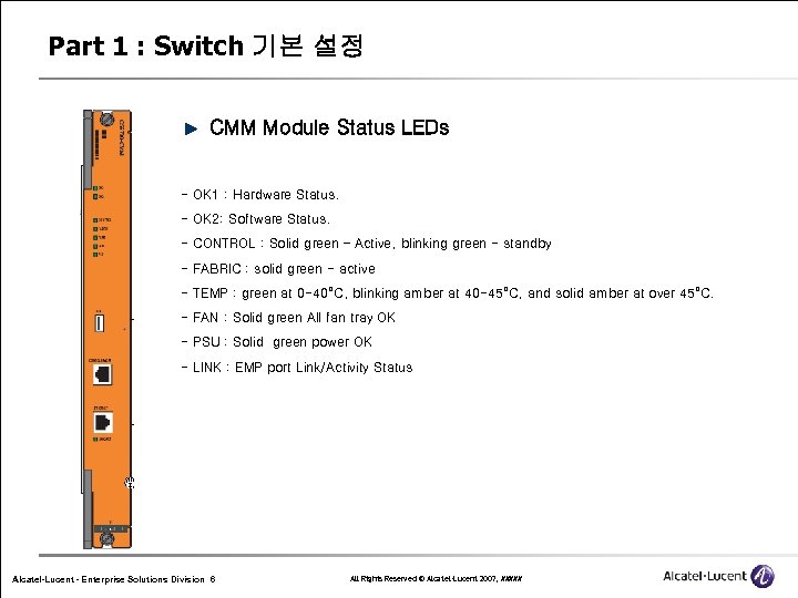 Part 1 : Switch 기본 설정 CMM Module Status LEDs - OK 1 : Hardware Status. - OK 2: Software Status. - CONTROL : Solid green – Active, blinking green - standby - FABRIC : solid green - active - TEMP : green at 0 -40°C, blinking amber at 40 -45°C, and solid amber at over 45°C. - FAN : Solid green All fan tray OK - PSU : Solid green power OK - LINK : EMP port Link/Activity Status Alcatel-Lucent - Enterprise Solutions Division 6 All Rights Reserved © Alcatel-Lucent 2007, #####