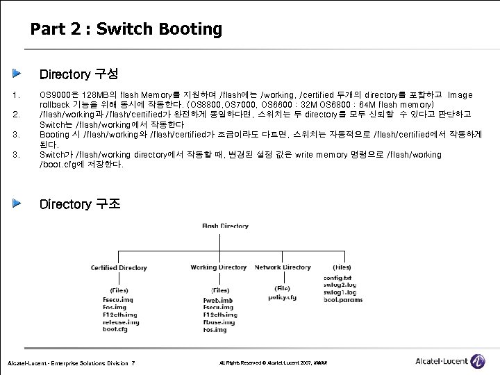 Part 2 : Switch Booting Directory 구성 1. 2. 3. 3. OS 9000은 128 MB의 flash Memory를 지원하며 /flash에는 /working, /certified 두개의 directory를 포함하고 Image rollback 기능을 위해 동시에 작동한다. (OS 8800, OS 7000, OS 6600 : 32 M OS 6800 : 64 M flash memory) /flash/working과 /flash/certified가 완전하게 동일하다면, 스위치는 두 directory를 모두 신뢰할 수 있다고 판단하고 Switch는 /flash/working에서 작동한다 Booting 시 /flash/working와 /flash/certified가 조금이라도 다르면, 스위치는 자동적으로 /flash/certified에서 작동하게 된다. Switch가 /flash/working directory에서 작동할 때, 변경된 설정 값은 write memory 명령으로 /flash/working /boot. cfg에 저장한다. Directory 구조 Alcatel-Lucent - Enterprise Solutions Division 7 All Rights Reserved © Alcatel-Lucent 2007, #####