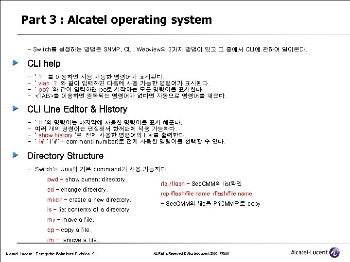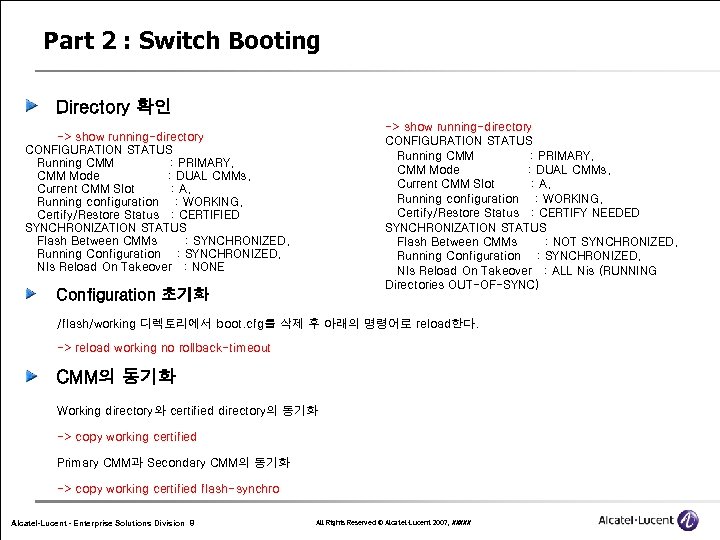 Part 2 : Switch Booting Directory 확인 -> show running-directory CONFIGURATION STATUS Running CMM : PRIMARY, CMM Mode : DUAL CMMs, Current CMM Slot : A, Running configuration : WORKING, Certify/Restore Status : CERTIFY NEEDED SYNCHRONIZATION STATUS Flash Between CMMs : NOT SYNCHRONIZED, Running Configuration : SYNCHRONIZED, NIs Reload On Takeover : ALL Nis (RUNNING Directories OUT-OF-SYNC) -> show running-directory CONFIGURATION STATUS Running CMM : PRIMARY, CMM Mode : DUAL CMMs, Current CMM Slot : A, Running configuration : WORKING, Certify/Restore Status : CERTIFIED SYNCHRONIZATION STATUS Flash Between CMMs : SYNCHRONIZED, Running Configuration : SYNCHRONIZED, NIs Reload On Takeover : NONE Configuration 초기화 /flash/working 디렉토리에서 boot. cfg를 삭제 후 아래의 명령어로 reload한다. -> reload working no rollback-timeout CMM의 동기화 Working directory와 certified directory의 동기화 -> copy working certified Primary CMM과 Secondary CMM의 동기화 -> copy working certified flash-synchro Alcatel-Lucent - Enterprise Solutions Division 8 All Rights Reserved © Alcatel-Lucent 2007, #####